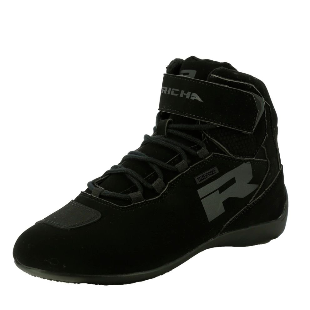 Baskets Richa ESCAPE WATERPROOF: Présentation: RICHA vous propose ses baskets moto homme les ESCAPE : Matière: En microfibre reconnu pour sa résistanceDoublure: Membrane waterproof étanche et respiranteProtections: Protections malléole homologuées CE Protège sélecteur Pointe renforcée Talon renforcéLes « + »: Fermeture par lacets Patte de serrage Velcro à la cheville  Inserts réfléchissants 3M pour une visibilité optimisée de nuit ou par faible luminosité Semelle extérieure antidérapante 100 % vegan-friendly. Aucune substance animale n’a été utilisée dans le processus de fabrication