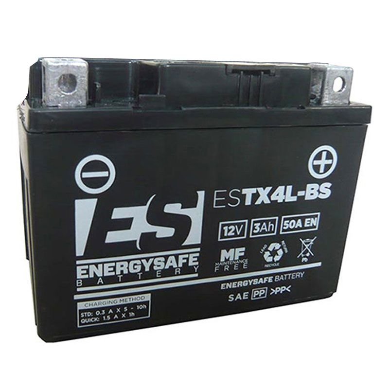 ENERGYSAFE vous présente la batterie moto ESTX4L-FA (référence équivalente « YTX4L-BS »).Elle s’impose comme la batterie polyvalente pour tous types de moto avec une qualité supérieure et sans entretien.Livré chargée et prête à l’emploi (pas besoin de remplir d’électrolyte ou de charger la batterie)Maintien en charge de la batterie garanti par le fabricantAvantages:Compression et performanceAuto-décharge ultra lenteL’additif anti-sulfates empêche le déchargement complet de la batterieHaute résistance aux vibrationsAucun entretienLivré chargée et prête à l’emploi (pas besoin de remplir d’électrolyte ou de charger la batterie)Caractéristiques:Matériaux « haute résistance », conçus pour absorber vibration et choc (AGM)Batteries au plomb haute capacité 12 VCouvercle étanche scellé à chaudMatériaux actifs à haute pressionAdditif anti-sulfatesConstruction haute résistanceDimensions (+/- 2 mm):Longueur mm: 113Largeur mm: 70Hauteur mm: 85Borne + : DroitePuissance (Ah): 3Voltage: 12v