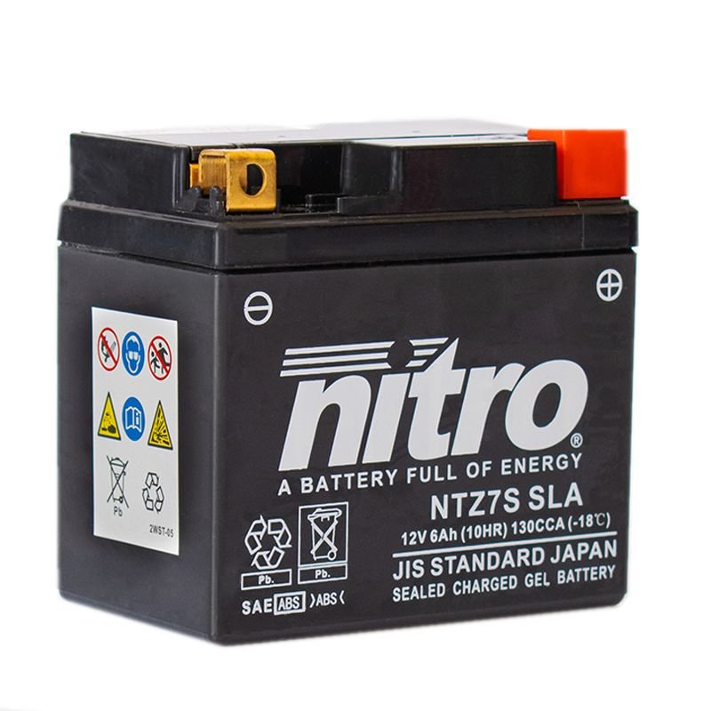 LGrace à cette technologie SLA, ces batteries Nitro ont plus de capacité de démarrage pour un volume plus réduit.Ces types de batteries ont le même système interne, réglé par une soupape, pour récupérer les gaz comme les batteries sans entretien mais ils sont complètement étanches donc déjà rempli d?acide.Avantage:Plus de capacité de démarrage pour un volume et un poids réduitPrête à l?emploi, remplie d?acide et chargéeÉtanchéité garantie, manipulation facile en toute sécurité, impossible de renverser l?acideSans entretien après le montageAGM-Gel Technologie (Fibre de verre absorbé, permet de monter la batterie dans toutes les positions.)Utilisation possible dans toutes les positions Dimensions (+/- 2 mm):Longueur mm: 113Largeur mm: 70Hauteur mm: 105Borne + : DroitePuissance (Ah): 6Voltage: 12v