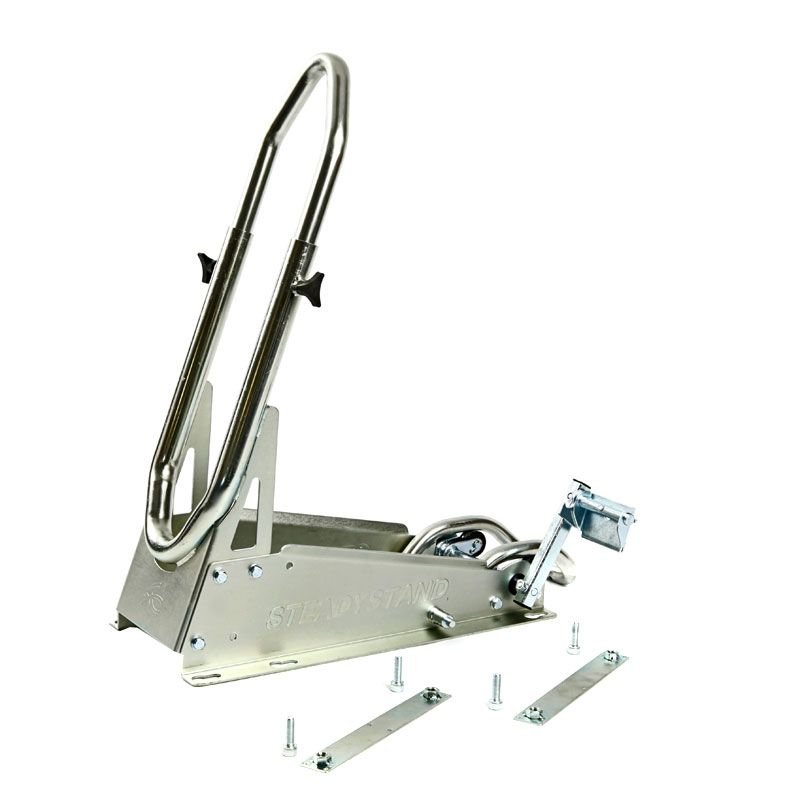 Le bloque roue SteadyStand Cross galvanisé d’Acebikes a été spécialement développé pour les motos tout terrain. Le bloque roue Steadystand Cross possède un système de serrage intelligent qui garantit à votre moto de ne pas bouger ou basculer. Ce bloque roue SteadyStand convient aux pneus de 18 à 21 pouces avec des largeurs de pneu de 90 à 120 mm. Grace à la pédale, on peut verrouiller la roue dans le Steadystand Cross. Cela vous évite de tirer sur la fourche et d’endommager les joints. En utilisant le bloque roue SteadyStand Cross, vous devrez uniquement utiliser des attaches pour sécuriser la partie arrière de votre moto. La pédale spéciale peut être installée des deux côtés du bloque roue SteadyStand Cross. Caractéristiques spéciales:Matériaux galvanisés solidesSpécialement développé pour les motos tout terrainLa pédale est fournie avec un système de verrouillage spécialSupport de montage au choix pour les pneus tout terrain petits ou grands.Platines de fixation permettant de retirer facilement le Steadystand CrossInstallation possible de la pédale à droite ou à gauche
