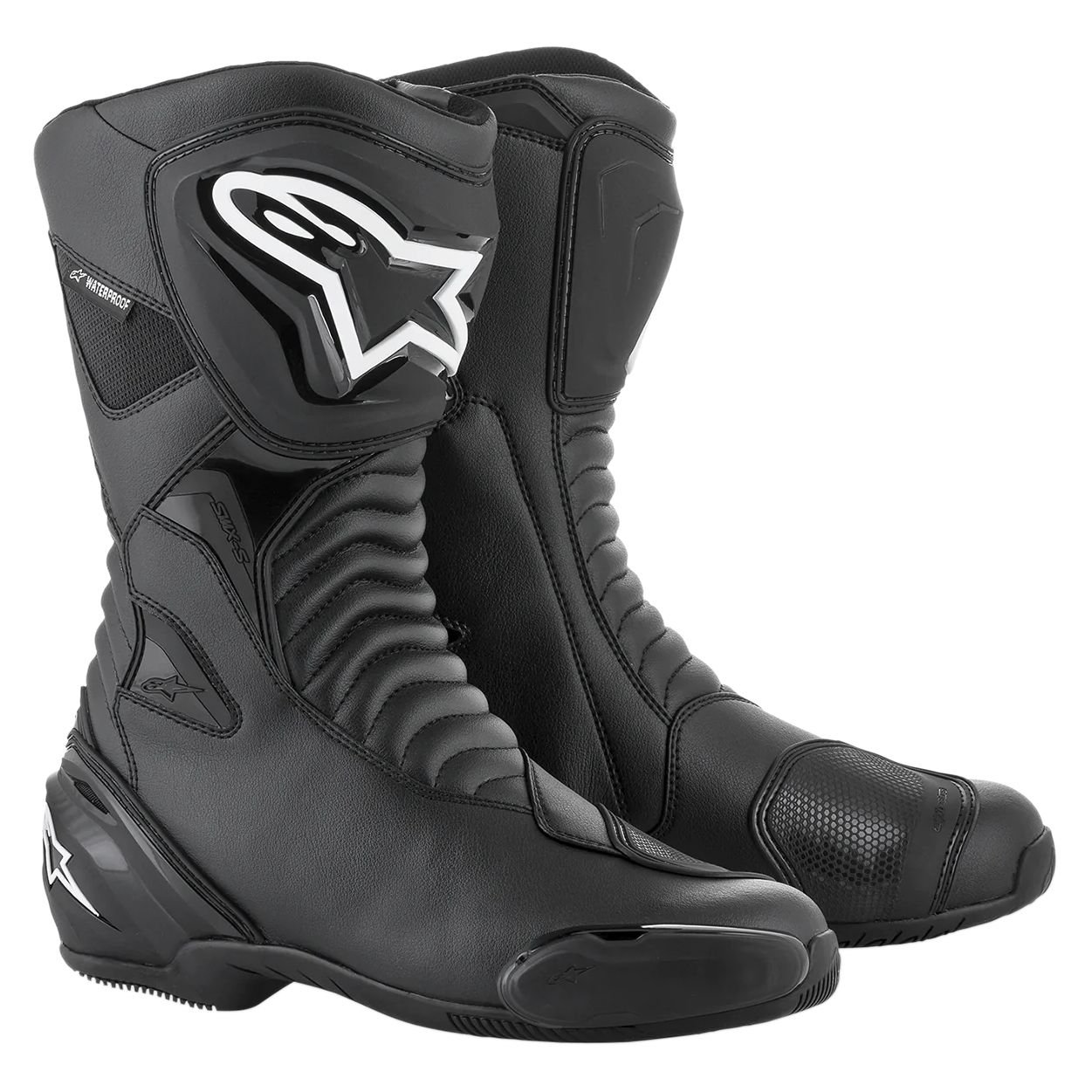 Bottes Alpinestars SMX S WATERPROOF: Présentation: ALPINESTARS vous présente ses bottes SMX S WATERPROOF : Matière: Tige fabriquée en microfibre résistante offrant confort et flexibilitéDoublure: Etanche grâce à sa membrane étanche et respirante Doublure intérieure en tissu respirant avec renfort anti-glissement en suède au talon pour maintenir le pied pendant le pilotage Protections: Protection de cheville en TPU double densité stratifiée sous la tige sur le côté médial et latéral pour offrir protection supplémentaire Support latéral de la cheville en TPR Nouvelle protection protège tibia conçue en TPU, plus ergonomique  Slider en TPU bi-injecté intégré et interchangeable doté du nouveau système de fixation assurant un remplacement facile et rapide (vis) Protection intérieure au niveau des orteils stratifiée sous la tige Renfort de sélecteur en TPU gaufréLes « + »: Avant-pied à la forme ergonomique garantissant une meilleure sensibilité des commandes de la moto Système d?ouverture/fermeture avec une fermeture éclair montée sur élastique et une zone de velcro ample pour un ajustement précis. L?ouverture est ample pour faciliter l?enfilage et l?enlevage Nouvelle semelle intérieure amovible et anatomique avec de la mousse EVA et du Lycra offrant confort et soutien Nouvelle semelle en mélange de caoutchouc exclusive Alpinestars favorisant la sensibilité, l’adhérence, la dispersion de l?eau et la durabilité
