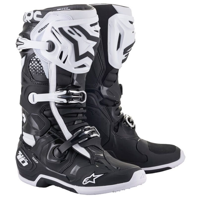 Bottes cross Alpinestars TECH 10 – BLACK WHITE 2023: Présentation: ALPINESTARS vous propose sa botte tout-terrain TECH 10 – BLACK WHITE : Matière: Empeigne en cuir pleine fleure offrant légèreté et souplesse pour un poids de 580g Coque 5 densités offrant robustesse contre les impactsDoublure: En poly-tissu avec mousse 3D à cellules ouvertes Suède antidérapant sur la zone du talon pour garder le pied à l’intérieur de la botte Protections: Coques en TPU résistants aux impacts et à l’abrasion DHCP : mousse en polystyrène expansée au niveau du talon amovible absorbant les chocs Système de lame TPU unique conçu pour prévenir l’hyper-extension frontale Plaque de protection du mollet profilée en TPU offrant une résistance aux chocs Protection en TPU et un rembourrage absorbant les chocs sur le talon et les chevilles Les « + »: Chausson amovible avec orthése de cheville afin de protéger l’articulation de la cheville Soufflet en microfibre douce aidant à éliminer les infiltrations excessives d’eau et de saleté Semelle compact, anatomique et démontable à double composé comprenant de la mousse EVA pour le confort et le soutien afin de répartir uniformément le poids Système de fermeture, de la protection frontale, double avec un rabat interne en microfibre Semelle externe amovible et changeable par Alpinestars Fermetures à pont en aluminium à haute résistance avec mémoire Système de verrouillage / déverrouillage rapide pour une sécurité de conduite améliorées Boucles très fines, amovibles et facilement remplaçables Flex Torsion Control : pour amortir l’hyper tension Zone d’avant-pied ultra fine et flexible pour une sensibilité et un contrôle accrus Système de grip sur l’intérieur de la botte