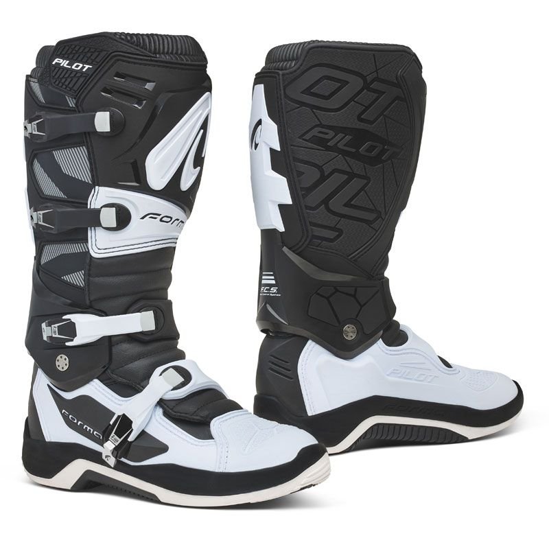 Bottes cross Forma PILOT BLACK/WHITE 2024: Présentation: Forma vous présente ses bottes moto tout-terrain Pilot : Matières: Tige en matériel synthétique Doublure intérieure rembourrée Semelle intermédiaire recouverte d’un feutre, avec renfort en nylon et fibre de verre dans la semelle pour un confort souple et une sécurité optimum Semelle extérieure en caoutchouc double densité pour une meilleure résistance à l’abrasion et une plus grande longévité Protections: Protections tibia, mollet et talon en plastique moulé injecté Semelle avec système anti-torsion et double stop de la flexion arrière de la cheville pour garantir une sécurité optimale de la cheville Protection anti chaleur en caoutchouc pour un grip maximal Les « + »: Semelle de propreté anti-bactérienne remplaçable avec insert en matériau EVA anti-chocs Semelle cousue avec coutures Goodyear directement sur la semelle intermédiaire pour une rigidité accrue et une utilisation durable Fermeture avec boucles en aluminium réglables et remplaçables Fermeture avec velcro sur partie supérieure