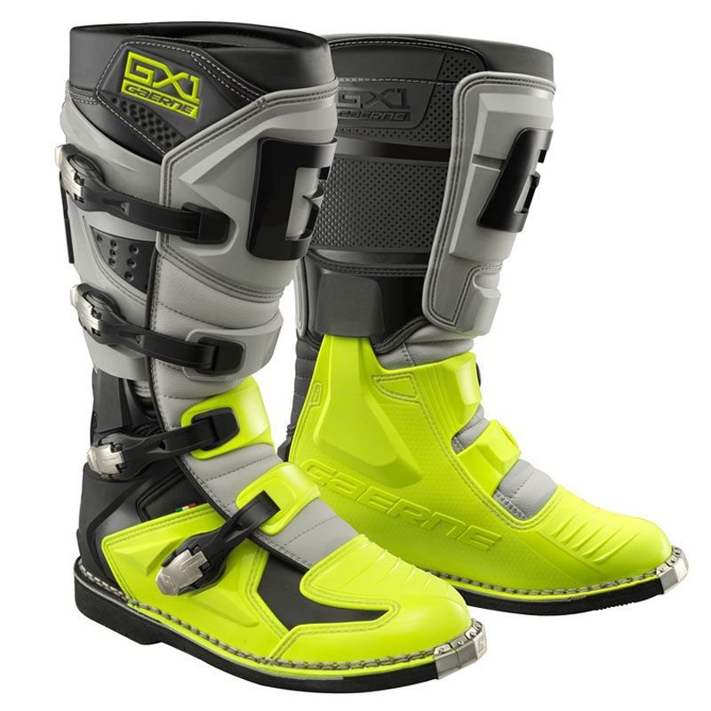 Bottes cross Gaerne GX-1 YELLOW/BLACK 2024: Présentation: Gaerne vous présente ses bottes tout-terrain GX-1 : Matières: Construites principalement en cuir pleine fleur, matériau hyper résistant de haute qualité Côté supérieur en daim pour une meilleure adhérence et résistance à la chaleur Intérieur en microfibre offrant confort et ergonomieProtections: Protection tibia en polyuréthane, résistant à la compression Renforts au niveau de la malléole et du sélecteur Pivot unique offrant un meilleur support de la cheville Les « + »: 4 boucles micrométriques remplaçables en aluminium, pour une fermeture facile, rapide et précise Les deux boucles supérieures peuvent être retirées afin d’y insérer des protections supplémentaires Semelle interne anatomique et remplaçable Semelle extérieure en caoutchouc à haute adhérence et garantissant une longue longévité