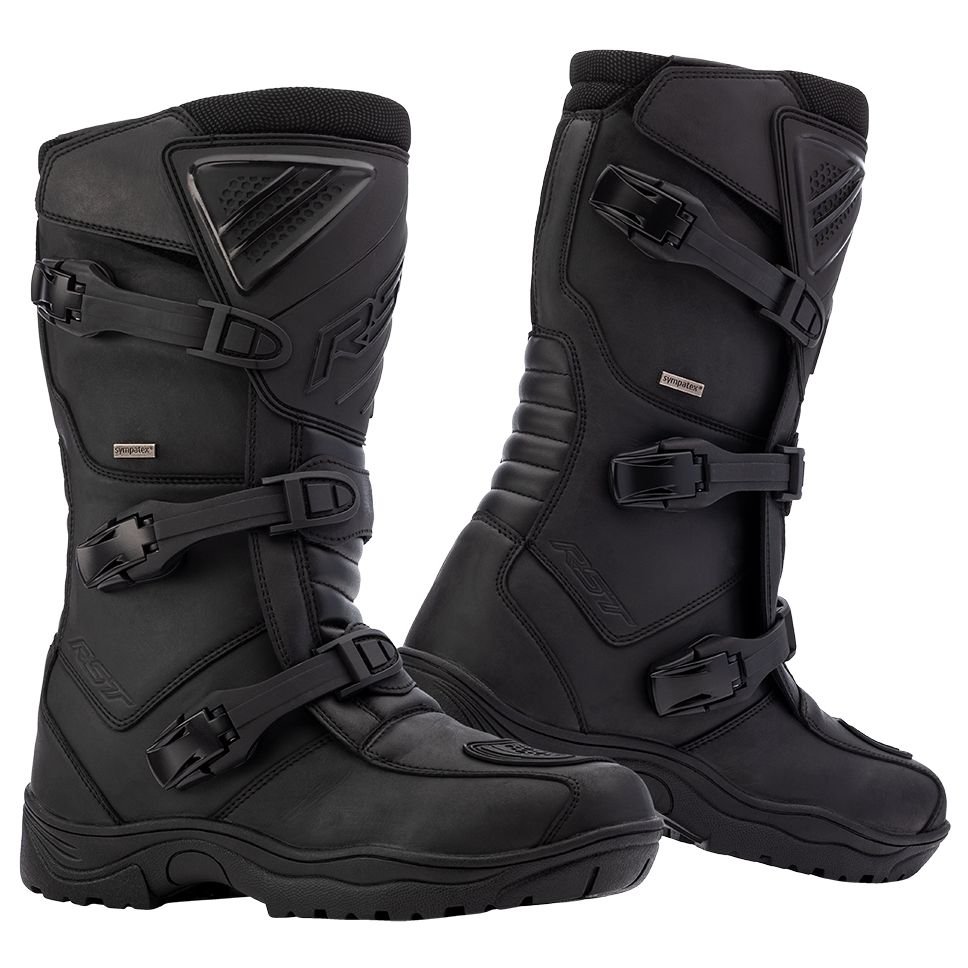 Bottes RST AMBUSH WATERPROOF: Présentation: RST vous propose ses bottes moto Trail Adventure homme les AMBUSH WATERPROOF :Matière: En microfibre, matière synthétique reconnue pour être aussi résistante que le cuir naturel Panneaux en cuir suédé Doublure: Membrane Sympatex® imperméable et respiranteProtections: Protections malléoles intégrées Protection talon intégrée Protège tibia en TPU Pointe renforcée Renfort sélecteurLes « + »: Tige haute Fermeture par 3 boucles Soufflets d’aisance pour une préhension des leviers optimisée Semelle intérieure en gel antibactérien Semelle intermédiaire en polycarbonate anti-torsion