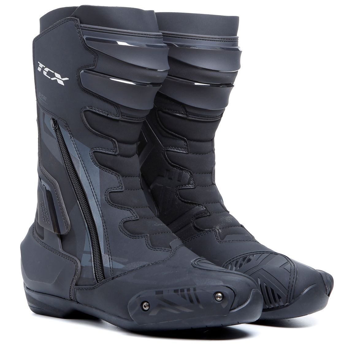 Bottes TCX Boots S-TR1: Présentation: TCX vous présente ses bottes moto racing homme les S-TR1 : Matière: Tige en microfibre, matière synthétique aussi résistante que le cuir Inserts latéraux en tissu extensible Stretch pour plus de confort et d’aisanceDoublure: Doublure mesh Air Tech respiranteProtections: Renfort tibia en PU Renfort malléole avec le système T.C.S (Torsion Control System) afin de limiter les torsions Slider avant en PU interchangeable Talon et pointe renforcés Renfort au niveau du sélecteurLes « + »: Ventilations efficaces pour les climats chauds Fermeture par zip latéral et velcro Semelle plantaire OrthoLite® à amortissement durable et hautement respirante Semelle extérieure Groundtrax® en caoutchouc résistante à l?usure, dessinée pour offrir une stabilité supérieure