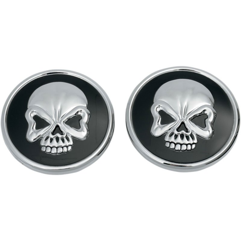 Drag specialties vous présente les bouchons de réservoir Skull:Matière: aluminiumVendu par paire (1 ventilé et 1 non ventilé)Finition: Chrome et noirSpécifique à chaque moto