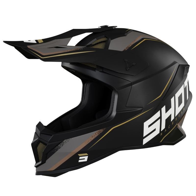 Casque cross Shot LITE PRISM – BLACK GOLD MATT 2022: Présentation: SHOT vous propose son casque Tout Terrain le LITE PRISM – BLACK GOLD MATT : Sécurité: En fibres tri-composite reconnu pour sa résistance avec un poids annoncé de 1100g +/-50 EPS Multi-densité pour une absorption des chocs optimisée Insert de mentonnière «Shock-Absorber» Fermeture de la jugulaire par boucle Double-D la plus sécurisante du marchéVentilation: 3 diffuseurs frontaux 2 extracteurs arrière afin d’expulser l’air viciéLes « + »: Intérieur entièrement démontable et lavable Intérieur «Morpho-Conforming» hypoallergénique ventilé Visière ventilée ajustable Protection vernis haute résistance Polyuréthane (PU)