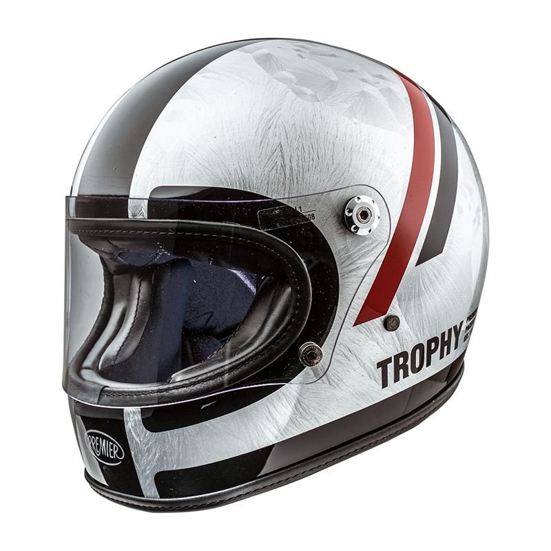 Casque Premier TROPHY DR DO: Présentation: PREMIER vous propose son casque moto intégral PREMIER – TROPHY – DR DO: Sécurité: En fibres de Carbone assurant résistance aux impacts pour un poids de 1200g +/-50 EPS de différentes densités pour une excellente absorption de l?énergie de l?impact Fermeture de la jugulaire par boucle Double-d la plus sécurisanteVisibilité: Écran incolore  anti-rayures offrant un large champs de vision Les « + »: Intérieur démontable et lavable Intérieur démontable et lavable traité Sanitized