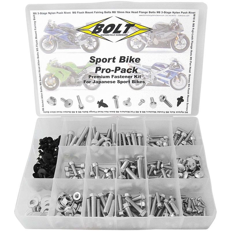 Fabriquée aux États-Unis, la visserie BOLT est une référence mondiale pour ce type de produits. Le kit de visserie reprend les caractéristiques de la première monte, avec une qualité de fabrication et une finition irréprochable.Il comprend: vis BTR, vis à tête bombée, vis à bride, rivets plastique, écrous à bride Fuji lock, vis de carénage, vis avec les rondelles en nylon, vis de bulle.Le kit Pro Pack comprend l?essentiel des vis, rondelles, entretoises? pour votre motoLe kit comprend environ 270 piècesVis et rondelles universellesCoffret spécifique pour motos sportives japonaises récentes