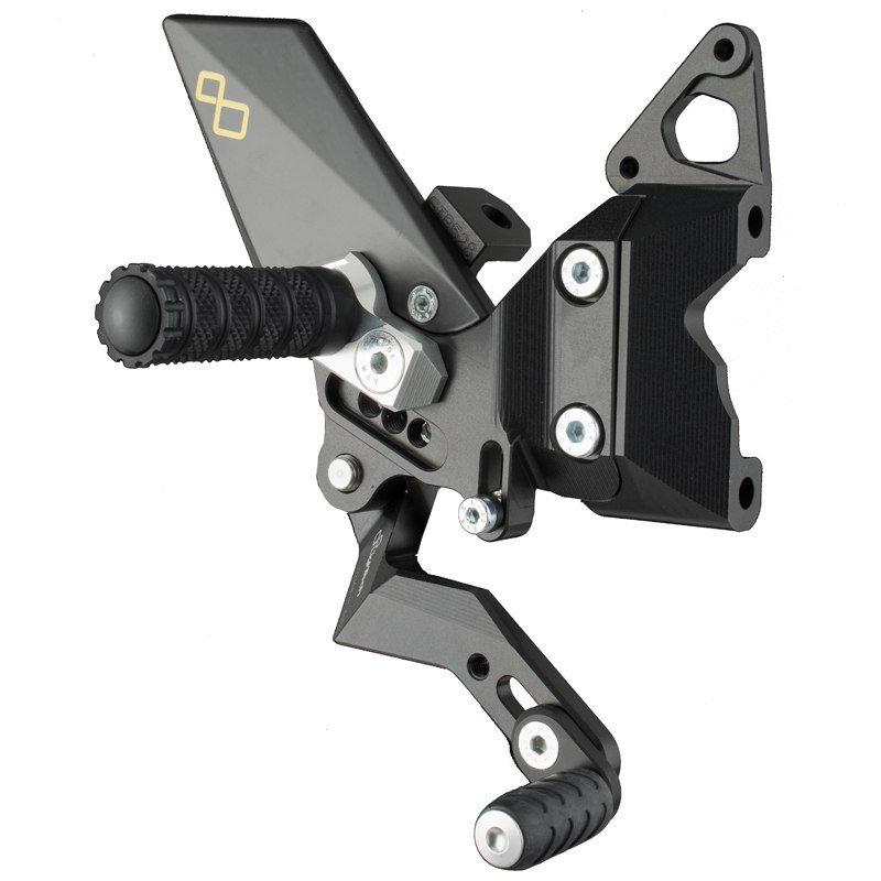 Lightec vous présente les commandes reculées inversées R version moto:Passage des vitesses inverséRepose pied et embout de sélecteur de frein/vitesses pliables apportant une sécurité à la moto en cas de chute, l’arrachement est ainsi évitéDotées d un système de réglage unique apportant confort et sécurité de pilotage sans égal sur votre moto8 positions de réglage du repose pied Equipées du Track Système permettant d’optimiser rapidement l’ajustement du repose pied via un système simple de rotation Support de repose pied rouge anodiséSélecteur et pédale de frein montés sur roulement SKF de qualité optimaleTaillées dans la masse offrant une rigidité exceptionnelle Protège talon en carbone « Black & Red »Visserie principale en titaneHomologuées TUV, ABE, FIM et FMMFaciles à installer sur la moto Utilisation piste