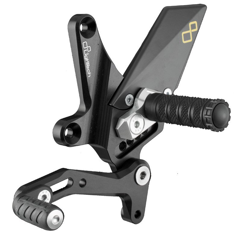 Lightec vous présente les commandes reculées R version moto:Repose pied et embout de sélecteur de frein/vitesses pliables apportant une sécurité à la moto en cas de chute, l’arrachement est ainsi évitéDotées d un système de réglage unique apportant confort et sécurité de pilotage sans égal sur votre moto8 positions de réglage du repose pied Equipées du Track Système permettant d’optimiser rapidement l’ajustement du repose pied via un système simple de rotation Support de repose pied rouge anodiséSélecteur et pédale de frein montés sur roulement SKF de qualité optimaleTaillées dans la masse offrant une rigidité exceptionnelle Protège talon en carbone « Black & Red »Visserie principale en titaneHomologuées TUV, ABE, FIM et FMMFaciles à installer sur la moto Utilisation piste