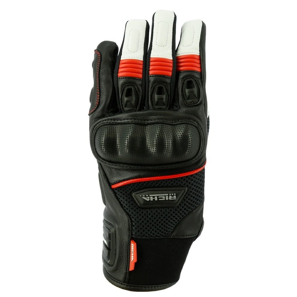 Gants Richa BLAST: Présentation: RICHA vous propose ses gants moto été homme les BLAST : Matière: Dos de la main en Mesh Stretch pour une circulation de l’air optimisée Paume et doigts en cuir de chèvre reconnu pour sa souplesse et sa résistanceProtections: Protection d’articulation en PVC homologuée CE Protection des doigts en TPR avec ventilation intégrée Protection Temperfoam sur les doigts et la paumeLes « + »: Manchette courte Patte de serrage Velcro Touch Screen permettant d’utiliser vos écrans tactiles sans ôter vos gants Inserts réfléchissants 3M pour une visibilité optimisée