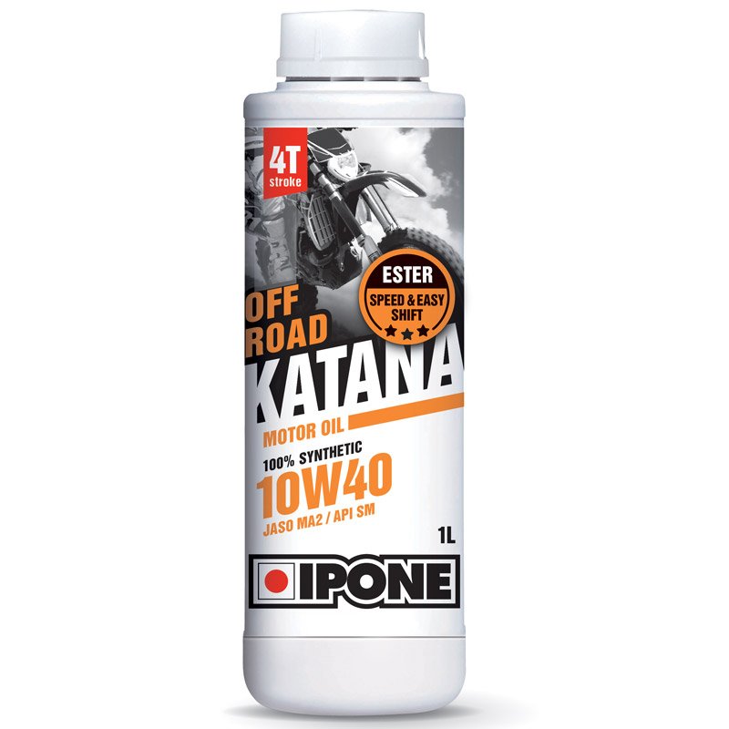 Ipone vous présente son huile tout-terrain, Katana 10W40 :Lubrifiant 100% synthèse,dédiée aux machines de compétition, et aux pilotes experts.10W40 100% SynthesisNormes : API SM – JASO MA2Contenance: 1 litreInnovation « Speed et easy » permet un passage de vitesse plus souple et plus rapide (sollicitations intensives de l’embrayage) et des montées en régime plus franches.Avantages :Dédié tout-terrain: package d’additifs renforcés en détergents, et dispersants pour protéger le moteur dans un environnement humideRésistance à des températures élevées. Produit recommandé pour les raids dans le désertMeilleure protection des cylindres car renforcée en estersPlus de km parcourus, moins de vidanges: le lubrifiant garde ses propriétés et sa viscosité plus longtempsL’embrayage ne patine pas: produit certifié JASO MAGrâce à sa formule optimisée, KATANA OFF-ROAD 10W40 conserve sa viscosité plus longtemps et maintient une protection durable du moteur.