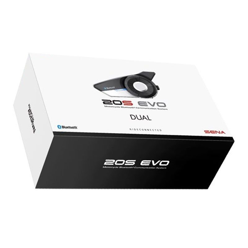 Sena vous présente le kit de communication 20S EVO – DUO: ( kit pour équiper 2 casques )Le kit de communication 20S EVO est la nouvelle génération de la gamme 20S, bénéficiant d?un design évolué et d?une amélioration de la stabilité et des fonctionnalités intercom qui vous permettent de poursuivre votre parcours. Le modèle 20S EVO présente une antenne fixe de type aileron de requin, à la différence de l?ancienne version dotée d?une antenne mobile. Cette nouvelle forme élégante de l?antenne améliore la stabilité intercom et sécurise la distance intercom, tandis que les mises à jour du matériel permettent un rendement général bien supérieur.Les fonctionnalités qui ont fait du 20S le système de communication Bluetooth numéro 1 mondial sont toujours présentes dans le modèle 20S EVO. Utilisez la fonction intercom mise à jour pour rester en contact avec huit autres personnes au maximum, et ce, jusqu?à 2 km via la fonctionnalité Groupe Intercom. Le modèle 20S EVO délivre un son en qualité HD limpide, précis et agréable en toutes circonstances. Advanced Noise Control de Sena fait en sorte que le bruit ambiant n?interfère pas avec le son entrant et sortant. La technologie Bluetooth 4.1, les haut-parleurs Bluetooth stéréo de haute qualité et l?architecture en deux modules offrent une expérience utilisateur transparente qui fait la renommée du modèle 20S.Général:Temps de conversation : 13 heuresTempérature de fonctionnement : -10 °C ~ 55 °C (14 °F ~ 131 °F) Dimensions :Module principal : 98 x 56,2 x 31,5 mm (3,9 x 2,1 x 1,2 po)Écouteur : diaphragme 40 mm ? épaisseur 6,5 mmMicrophone sur tige : longueur 190 mmCâbles entre haut-parleurs : longueur 555 mmPoids Module : 61 g (2,15 oz)BLUETOOTHProfil casque (HSP)Profil mains libres (HFP)Profil de distribution audio avancé (A2DP)Profil de commande à distance audio / vidéo (AVRCP)Bluetooth 4.1INTERCOMDistance d?utilisation : jusqu?à 2 kilomètres en plein air DeleteAUDIOAdvanced Noise ControlCodec SBC intégréRéglage du volume globalTaux d’échantillonnage : 48 kHz (CNA) maxRADIO FMRadio FM intégrée avec RDS AF (Radio Data System Alternate Frequencies)Couverture de la radio : niveau mondialSpécifications de fréquences de la radio : 64 ~ 108 MHzPossibilité d’enregistrer 10 stations avec fonction de recherche automatiqueBATTERIETemps de charge : 2,5 heuresType : Lithium polymère