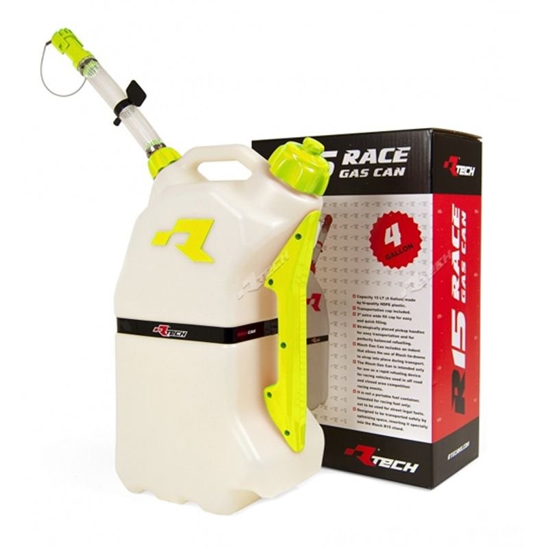 R-tech le bidon à carburant  GAZ CAN de 15 litres:Capacité 15 Litres en plastique HDPE de haute qualité.Capuchon de transport inclus.Capuchon de remplissage extra-large de  » 3″ pour un remplissage facile et rapide.Poignées de ramassage stratégiquement placées pour un transport facile et un ravitaillement parfaitement équilibré.Le Rtech Gas Can est uniquement destiné à être utilisé comme un dispositif de ravitaillement rapide pour les véhicules de course utilisés dans les compétitions hors route et en circuit fermé.Ce n’est pas un conteneur de carburant portable. Destiné au carburant de course seulement.Conçu pour être transporté en toute sécurité en optimisant l’espace, en l’insérant spécialement dans le support Rtech R15 (vendu séparément).