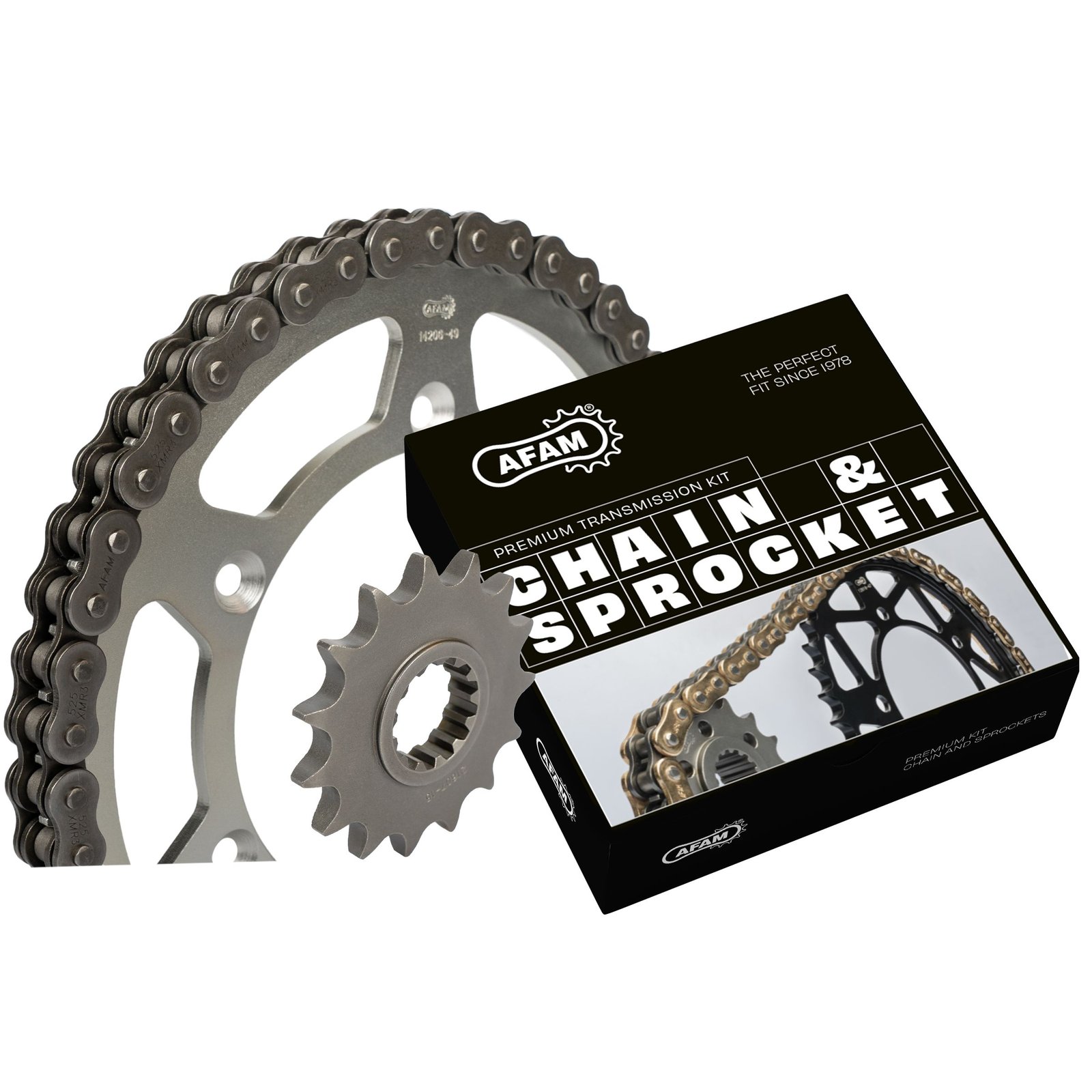 Kit chaine AFAM 525 Type Acier: Descriptif: La technologie Afam est recherchée par de nombreux teams Racing dans le monde. Provenant d’une expérience dans les secteurs route, tout-terrain ou racing, le savoir-faire est appliqué dans notre production de couronnes, pignons et chaines. Afam est une marque de classe mondiale. Plus de 25 ans d’expérience en R&D sur GP500 et MotoGP ont abouti à une spécialisation avancée. Avec plus de 7.000 références, Afam a probablement la plus large gamme en couronnes et pignons pour le marché de remplacement ou de conversion.Les couronnes acier Afam ne sont pas uniquement des produits de remplacement. En plus d’une large gamme d’alternatives de conversion disponibles, la qualité des couronnes acier Afam dépasse la qualité d’origine. AFAM utilise le meilleur alliage pour la production de ses pignons. Grâce à sa technologie en terme d’usinage et de dureté, AFAM vous garantit la qualité que vous êtes en droit d’attendre pour votre moto.Le kit chaine est l’entrée de gamme Afam, Il se distingue par son pignon standard, la chaine de couleur acier et de qualité légèrement inférieure à celle d’origine et une couronne en acier de couleur griseCaractéristiques: Référence: KIT100341Pignon nombre de dents: 14Pignon standardPignon anti-Boue: NonCouronne nombre de dents: 44Matière couronne: Acier  Couronne anti-boue: NonQualité de la chaine: Xs-Ring Renforcée (XMR3)Pas de chaine: 525Longueur de chaine/nombre de maillons: 108Type chaine: A525XMR3Couleur chaine: acierJoints toriques: OuiType joints toriques: XS’RingType attache: Attache RivetAxe creux ou pleins: Axes creux