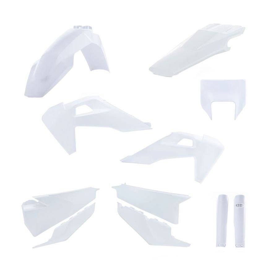 Acerbis vous présente le kit plastique Full : 1 garde boue avant1 garde boue arrière2 ouïes de radiateur2 plaques latéralesBas de fourcheCouleur blanc