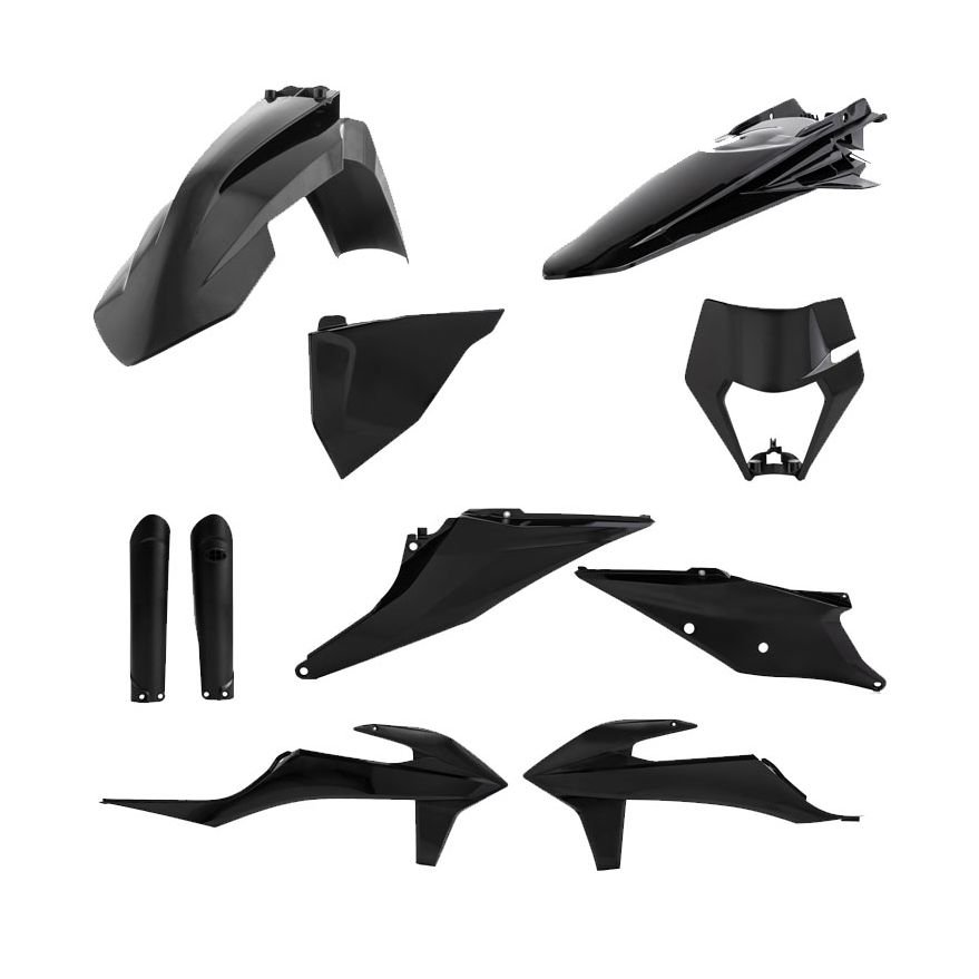 Acerbis vous présente le kit plastique Full : 1 garde boue avant1 garde boue arrière2 ouïes de radiateur2 plaques latéralesBas de fourcheCouleur noir