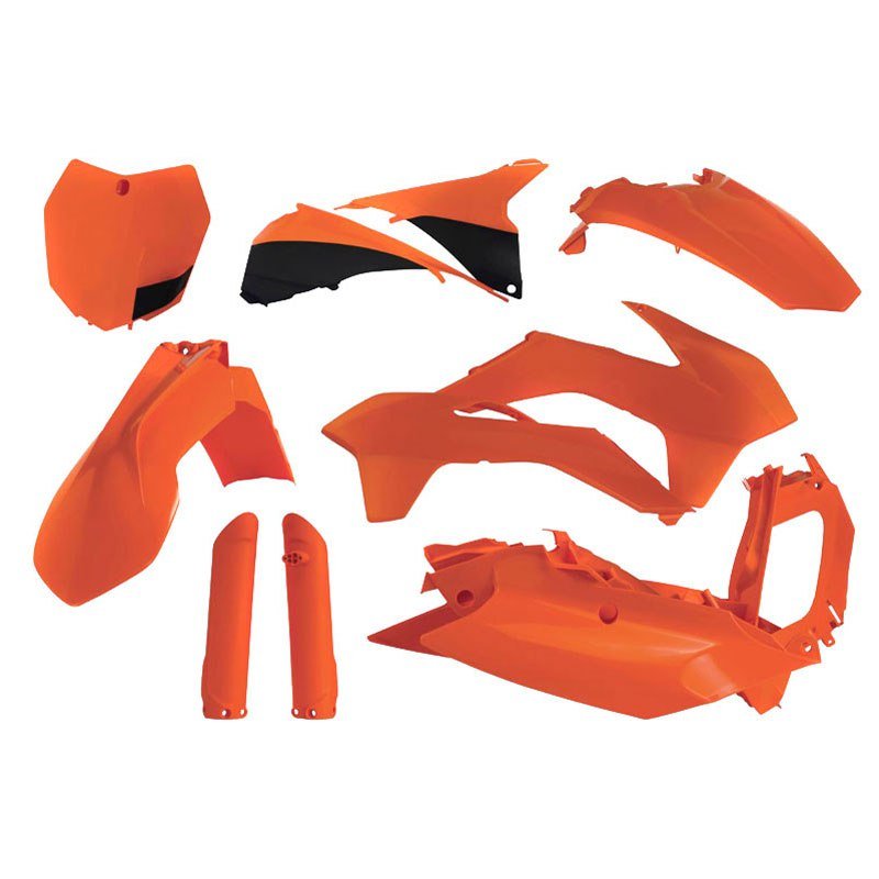 Acerbis vous présente le kit plastique Full : 1 garde boue avant1 garde boue arrière1 plaque frontaleCache de boite à air2 ouïes de radiateur2 plaques latéralesBas de fourcheCouleur Orange