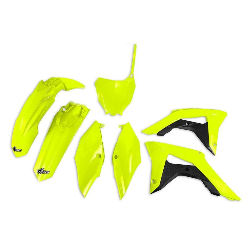 Le kit plastique UFO est composé de:2 plaques latérales1 garde-boue avant1 garde-boue arrière1 plaque frontale2 ouïes de radiateursCouleur jaune fluo