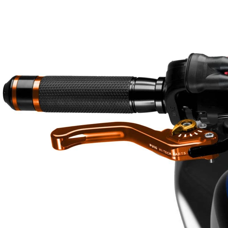 Puig vous présente le levier de frein court 3.0: Evolution de la version 2.0, Puig a mis l’accent sur l’amélioration ergonomique de la pièce et le renouvellement esthétique des leviers pour apporter une touche moderne et agressive à la moto.La nouvelle forme des leviers permet une adaptation parfaite de la pièce à votre main, ce qui garantira une meilleure adhérence et une plus grande accessibilité à la conduite.En ce qui concerne l?amélioration esthétique, Puig a renouvelé tous les graphiques inclus dans la pièce en les adaptant aux temps nouveaux.Les leviers PUIG 3.0 sont disponibles en 4 modèles: court, fixe, rabattable et rabattable extensible.Les leviers Puig 3.0 ont le certificat TÜV et sont homologués par l’organisme Allemand ABE 9129.Caractéristiques:Meilleure ergonomie, leur profil a été modifié sur la zone d?appui des doigts pour une utilisation optimaleCouleur du levier de frein: OrangeCouleur de la molette: 7 coloris au choix (selon la disponibilité)Type courtHomologué Tûv et ABE 9129Longueur: 129 mm