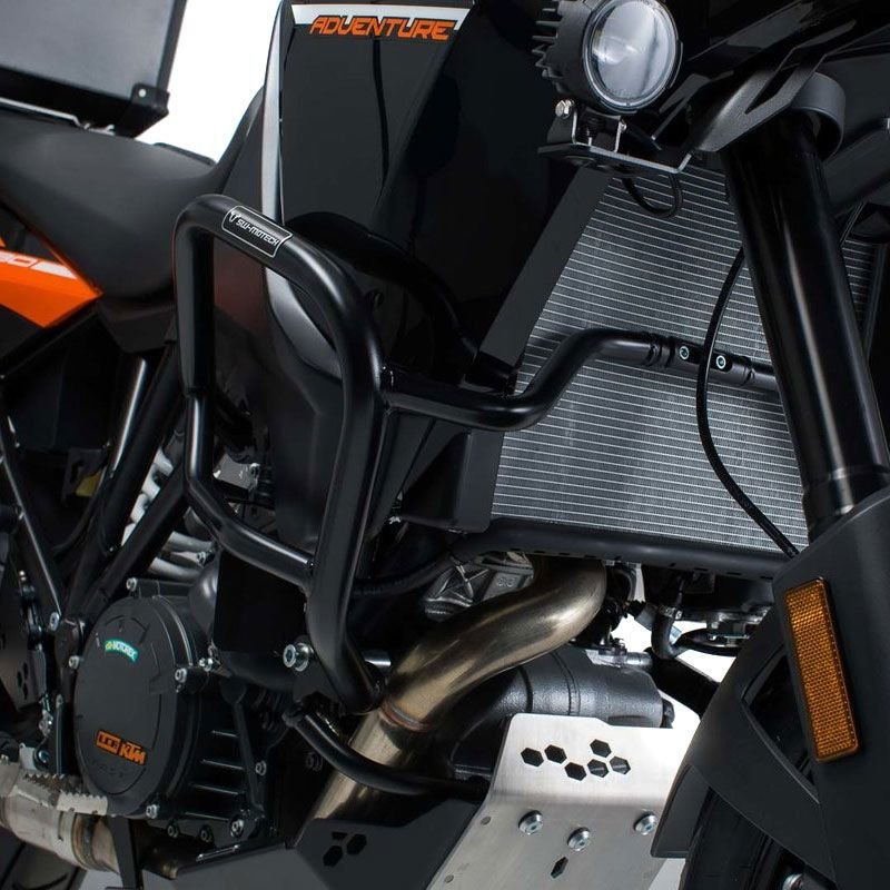 Crashbar SW-MOTECHLa meilleure protection en cas de chute ou de collision : le crash-bar, dont le diamètre est de 22/27 millimètres, protège de nombreuses pièces comme le carénage et le réservoir. Cette protection contre les chutes a été développée spécifiquement pour l?Aventure et s?installe sur les points de fixation du cadre. Ces fixations apportent une grande stabilité au montage et une facilité d?installation car aucune soudure ou perçage ne sont nécessaires. Le montage des crashbars nécessite le démontage des caches latéraux. Une laque époxy noire protège le crash-bar contre la corrosion et les égratignures.Caractéristiques:Fixations solides sur les points de montage existants du cadreDiamètre du tube 22/27 mmSurface laquée époxy noireFixation sans soudure ni perçageContenu:2 crashbars (barres de protection)Matériel de montageNotice de montage