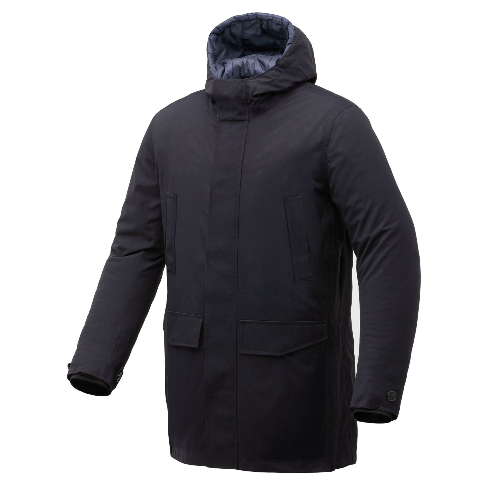 Parka Tucano Urbano MONTE HYDROSCUD®: Présentation: Tucano Urbano vous propose son parka moto toutes saisons MONTE: Matière: Extérieur HYDROSCUD® en polyester stretch recyclé, coupe?vent et étanche Good Wheels : La production de  cet article permet le recyclage d?un maximum de 30 bouteilles de plastique Doublure fixe en polyester Veste interne thermique détachable, à porter séparément, rembourrage en ouate thermique de polyester recycléThermicité 5/5Protections: CPS AEROSOFT ultralégères et ventilées Protections AEROSOFT CE ? Niveau 1 sur les épaules et les coudes Poche pour protection dorsale compatible avec les modèles VIPER CE D3O® Niveau 2 Les « + »: Coutures thermo soudées Rabat anti?gouttes sur la fermeture éclair centrale  REFLACTIVE® SYSTEM? Visibility on demand sur les poignets   Poignet coupe?vent avec ouverture pour le pouce Capuche ergonomique ajustable pour système anti?flottement Coulisse à la taille Réglages sur les poignets Poche intérieure étanche sur la poitrine, avec doublure en microfibre pour ranger les lunettes  Poches réchauffe?mains  Poches intérieures et extérieures de différentes dimensions AIRSCUD CONNECTION : système d?attache à l?airbag l’AIRSCUD, gilet doté du système IN&MOTION AIRBAG Longueur 86 cm (taille 50 IT?L)Coupe Regular Fit
