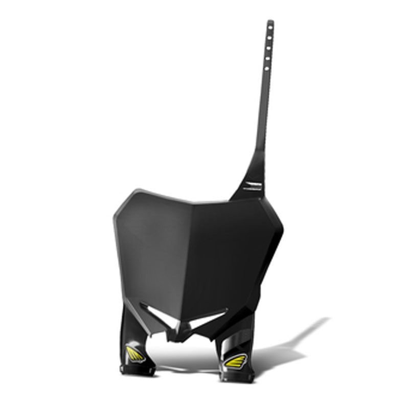Plaque numéro frontale Cycra.Fabrication haut de gamme avec plastique injecté.Ultra fine et légère, compatible avec les tés de fourche d’origine et autres tés adaptables.Compatible avec les fonds de plaque du marché.Guide câble et colliers inclus.