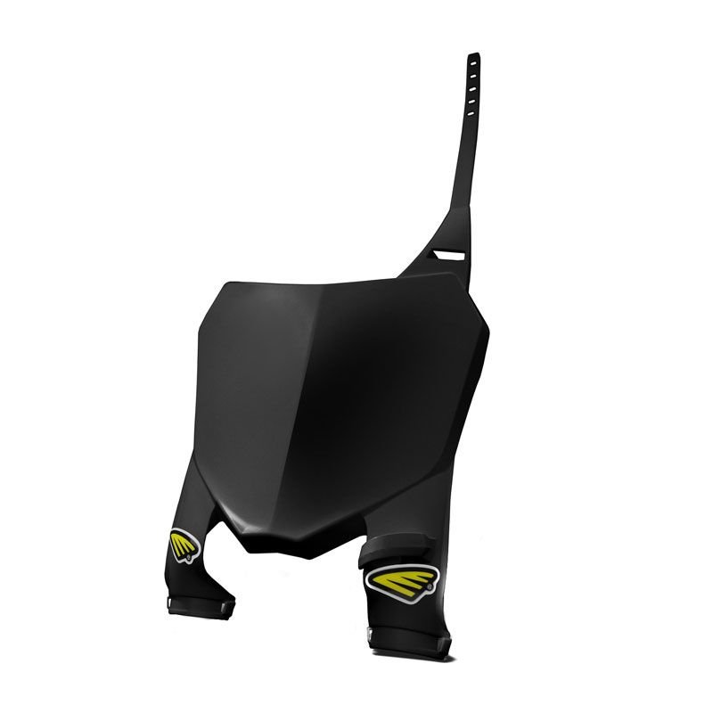 Plaque numéro frontale Cycra.Fabrication haut de gamme avec plastique injecté.Ultra fine et légère, compatible avec les tés de fourche d’origine et autres tés adaptables.Compatible avec les fonds de plaque du marché.Guide câble et colliers inclus.