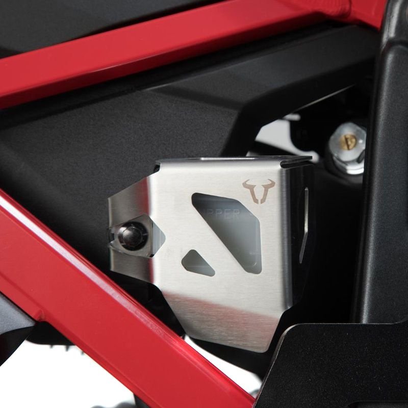 La protection compacte du réservoir de liquide de frein protège le réservoir de liquide de frein d’origine contre les jets de pierres, tout en empêchant le retrait intempestif du couvercle. Le protecteur peut être fixé sur la moto en quelques étapes simples.Look et finition élégantesProtection du réservoir de liquide de frein d’origine contre les jets de pierresEmpêche le retrait intempestif du couvercle.Inclus:1 x Protection de réservoir de liquide de freinNotice d’installationMatériel de montageCaractéristiques:Matériaux : Acier inoxydableÉpaisseur du matériau : 0,15 cmCouleur : argentPoids : 0,1 kg
