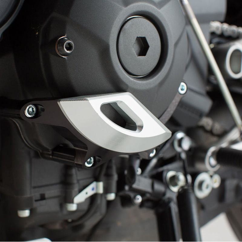 Protection fraisée en alliage d’aluminium à haute résistance pour couvercles de carter de moteur à droite et à gauche. La construction élégante protège efficacement les parties exposées du boîtier contre les dommages importants en cas de contact avec le sol et en cas de chute. Les protections sont en métal léger anodisé noir. Sur le côté gauche, une pièce d’usure remplaçable en gris anodisé est fixée pour un renforcement supplémentaire.Protection fiable contre les dommages importants pouvant affecter le couvercle du boîtierProtection des côtés droit et gauche du boîtierAucune altération du comportement de conduiteFraisé par CNC pour un ajustement précis et un look attrayantMontage simple aux points de fixation d’origine du carterEn alliage aluminium extrêmement robuste, anodisation résistante aux intempériesInclus:1 x Protection de couvercle de carter moteurNotice d’installationMatériel de montageCaractéristiques:Matériaux : AluminiumSurface : anodiséCouleur : noirPoids : 0,2 kg