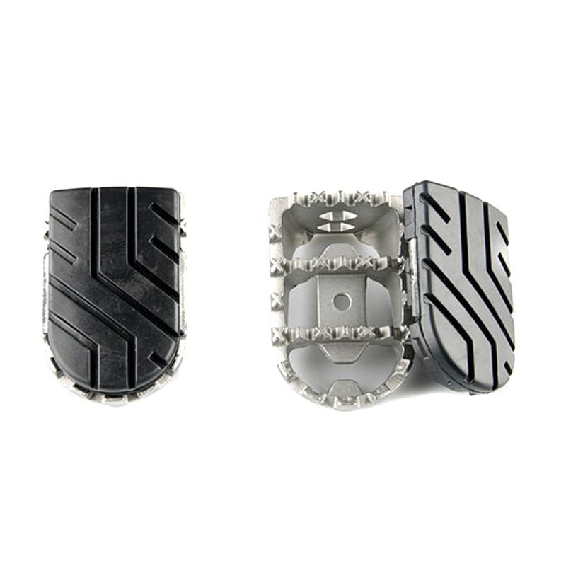 Les kits de repose-pieds permettent d’installer le repose-pied à sa hauteur d’origine ou 15 mm plus bas. Extrêmement robustes et durables, les repose-pieds en acier inoxydable offrent une très excellente adhérence et sont recommandés pour les motos d’aventure, de route et off-road. Des charnières en alliage d’aluminium à haute résistance permettent au repose-pieds de se replier lorsque la moto se renverse. Un patin en caoutchouc amovible réduit les vibrations, le profil offre une bonne adhérence, même en off-road. Pour monter les adaptateurs charnières spécifiques à chaque modèle sur les supports de repose-pieds, le matériel de fixation d’origine est utilisé (ressorts, boulons…).Montage facile sur le support du repose-pied d’origineRéglage individuel : hauteur d’origine ou abaissement du repose-pieds de 15 mmConfort de conduite accru grâce à la grande zone de contactAntidérapant grâce à la structure de la surface profiléeEn acier inoxydable moulé avec une protection optimale contre la corrosion et patin en caoutchouc détachableMatériel de montage inclus dans la livraisonInclus:2 x Repose-pieds ION2 x adaptateur de joint spécifique au modèleNotice d’installationMatériel de montageCaractéristiques:Matériaux : Acier inoxydable / CaoutchoucCouleur : argent / noirPoids : 1.1 kg
