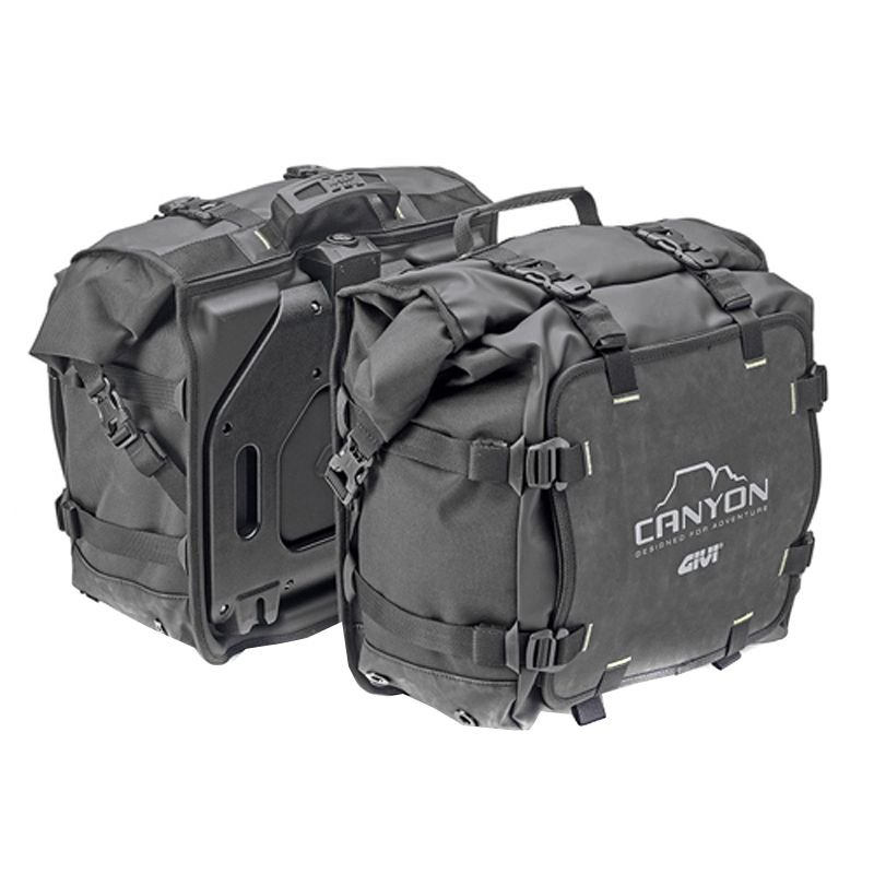 Sacoches cavalières Givi GRT720 – (2 x 25 LITRES): Présentation: Paire de sacoches latérales étanches, 25 + 25 lt. Conçus par GIVI pour les motos Enduro tout-terrain, ils sont équipés d’un système d’attelage / déverrouillage MONOKEY®, compatible avec le côté tubulaire PL_ _ _, PLR_ _ _, PLO_ _ _MK, PLOR_ _ _MK, PLO_ _ _N (+ OFMK) cas, PLOR_ _ _N (+ OFMK), vendu séparément. Équipé d’une clé de verrouillage de sécurité, qui peut être combinée avec celle du topcase et de la boîte à outils, si nécessaire, à l’aide des kits SL102-SL103-SL105. Les sacoches latérales GRT720 Canyon, grâce aux boucles latérales dont elles sont équipées, vous permettent de moduler la configuration des bagages pour s’adapter à vos besoins de chargement, des courtes excursions en moto d’une journée aux trajets plus longs et plus exigeants, à affronter l’ajout de GRT722 comme chargement latéral supplémentaire, résiste aux fortes pluies et aux conditions extrêmes.Matériaux: Polyester haute ténacité 1200D W / R et dos en PE thermoformé Revêtement haute ténacité 1680D / PU Hypalon Matériaux extérieurs à haute résistance aux rayons UVéquipements: Système de fermeture étanche Roll Top Sangles supérieures et inférieures réglables équipées d’une fermeture à pince pour assurer la rétention de la tension Sangles équipées aux extrémités d’une fermeture de paquet déchirable Rabat avant équipé à l’arrière d’une poche en filet pvc robuste 8 boucles latérales pour moduler des charges supplémentaires comme le sac GRT722 8 points de compression de charge ?illets latéraux pour liquides Poignée ergonomique Sac intérieur étanche jaune fluorescent scellé à haute fréquence (indice d’étanchéité IPX5, résiste à de fortes pluies et aux conditions extrêmes) Renfort plastique amovible pour rigidifier le fond du sac Imprimés à motifs réfléchissants pour une meilleure visibilité Dimensions: HxLxP 40x21x40cmPoids total: 4.4 kgLitrage : 2 x 25 litres