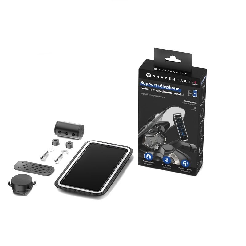 Compatible tableau de bord de scooter (espace de 4cm à percer pour visser le support) Pochette universellePochette XL : Téléphone max 9.2 x 16.2 cmPochette imperméable, textile étanchePochette parfaitement tactile, compatible avec face id et capteur d’empreinte optiqueOrientable à 360° (paysage / portrait / …)Ouverture pour port USB / écouteursSystème magnétique breveté supportant jusqu’à 50 fois le poids du smartphoneStable même à grande vitesse (testé jusqu’à 215km/h sur circuit)Vitesse théorique maximale : 280km/h