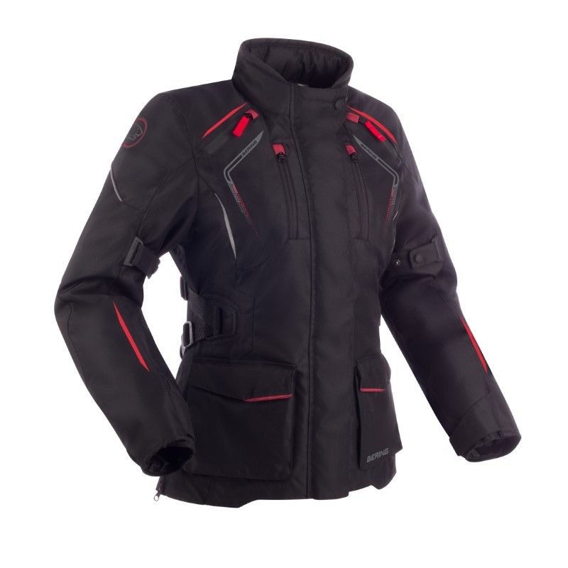Veste Bering LADY VISION: Présentation: BERING vous propose sa veste moto Touring de la gamme Discovery conçue pour la femme la LADY VISION : Nous vous conseillons d’associer cette veste au pantalon LADY VISION pour un équipement complet. Matière: En Fibretech 600D reconnu pour sa résistance de part son maillage Renforts en Armex réputé pour sa résistanceDoublure: Doublure de confort en Mesh, en fibres recyclées, pour plus de respirabilité Membrane BWTECH Classic étanche et respirante Doublure thermique SHELLTECH Super amovibleProtections: Protections épaules Protect Flex OMEGA homologuées CE Protections coudes Protect Flex OMEGA LADY homologuées CE Prédisposé à recevoir une protection dorsale OMEGA homologuée CE niveau 2 OU de niveau 1 Ventilation: Système d’aération Pulse AirLes « + »: Col haut avec serrage pression Patte de serrage Velcro aux poignets Patte d’ajustement Velcro à la taille Système anti-battement sur les bras Zips d’aisance sur les cotés pour plis de confort sur la moto Zip de raccordement veste et pantalon Eléments réfléchissants 3M Scotchlite pour une visibilité optimisée Regular Fit : coupe droitePoches: 4 poches extérieures 2 poches intérieures 1 poche portefeuille