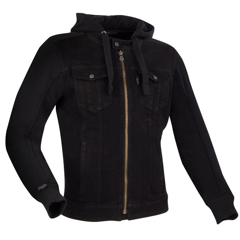 Veste Jean Segura JESSY DENIM: Présentation: SEGURA vous propose son blouson moto en jean le JESSY : Matière: En denim Stretch réputé pour sa résistance et son confort Manches en coton très perméables à l?airDoublure: Doublure de confort fixe Mesh pour un flux d’air optimiséProtections: Protections épaules Protect Flex ALPHA homologuées CE Protections coudes Protect Flex ALPHA réglables homologuées CE Prédisposé à recevoir une protections dorsale Protect Flex ALPHA homologuée CE de niveau 1 ou de niveau 2 Les « + »: Col court avec fermeture par bouton pression Capuche fixe avec cordon de serrage Bords côtes sur les manches pour un ajustement précis Patte d’ajustement à la taille par bouton pression Body Fit : coupe ajustée près du corpsPoches: 4 poches externes