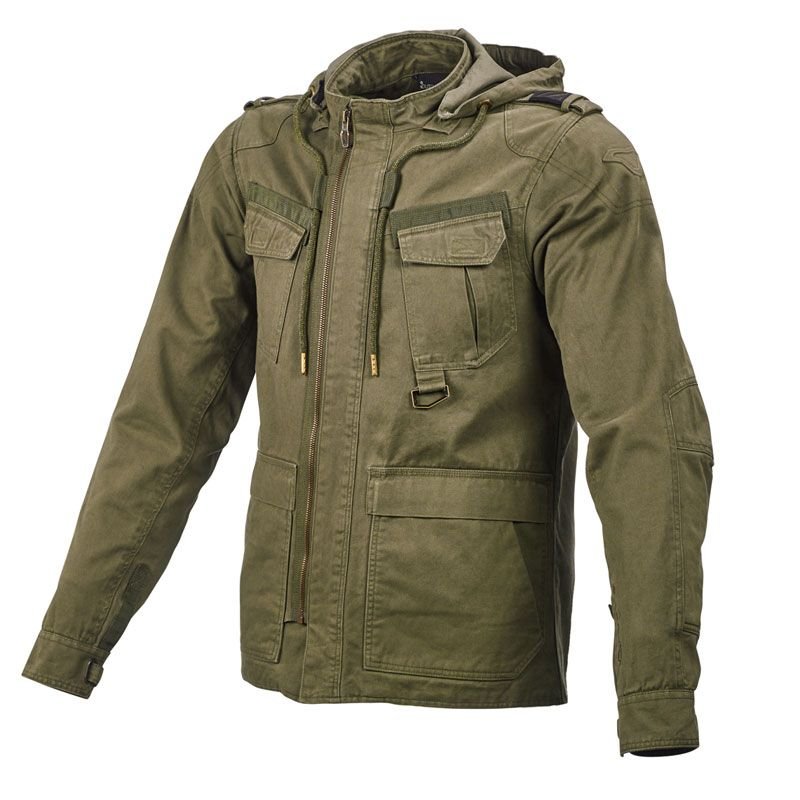 Veste Macna COMBAT: Présentation: Macna vous présente sa veste moto Combat : Matière: Veste en coton  Renforts d?Aramide sur les coudes, dos et épaules Doublure fixe en meshProtections: Protections aux épaules et aux coudes avec certificat CE Niveau 1 EN 1621-1: 2012 Prédisposition pour une protection dorsale disponible en option Certifié CELes « + »: Capuche détachable avec bouton à l?arrière pour la maintenir lors du roulage Porte-clés à l?avant Boucle de ceinture Sangles de manchettes aux poignets Multiples poches frontales Poche intérieure
